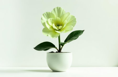 Close-up of an elegant green flower with lush petals and leaves in a simple white pot on a minimalistic background. The plant is well-lit, highlighting its natural beauty.