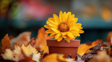 A vivid yellow flower stands out in a small pot, nestled among a blanket of colorful autumn leaves, creating a serene and cheerful atmosphere.