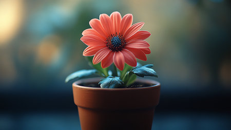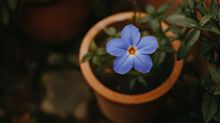 A vibrant blue flower elegantly emerges from a terracotta pot, surrounded by lush green leaves, creating a peaceful and serene outdoor atmosphere. Perfect for nature themes.