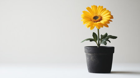 A vibrant yellow flower stands tall in a black pot, contrasting beautifully with a plain background, capturing the essence of nature in a serene indoor atmosphere.