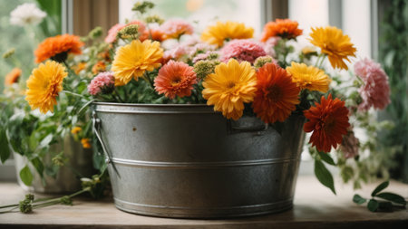 Colorful autumn flowers in a bucket on the windowsill. Floral background