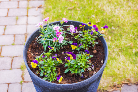 Close-up view of street vase with blooming flowers, carnations, and pansies on a sunny spring day.