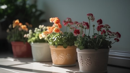 Flowers in pots on the windowsill. Shallow DOF