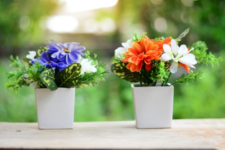 Flower and plant in pot on table with colorful background