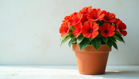 Vibrant red flowers in terracotta pot on bright background