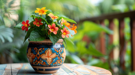 A decorative clay pot with intricate designs, holding a vibrant flowering plant, set on an outdoor table