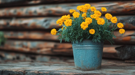 A rustic wooden background with yellow marigolds in an old metal bucket, set against weathered wood planks. The flowers add warmth and color to the scene, creating a cozy atmosphere that evokes nostalgia for vintage farm life. This backdrop is ideal for product photography or a home decor theme. --chaos 30 --ar 16:9 --v 6.1 Job ID: cbb44d95-2e6f-499f-8914-585a71599d2d