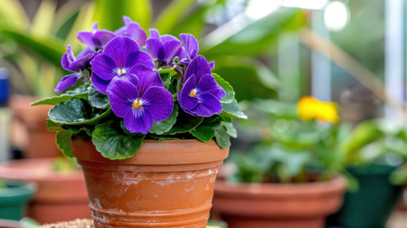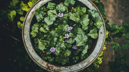 A captivating view of vibrant green leaves with delicate purple flowers growing in a rustic pot, perfect for enhancing any garden or indoor space.