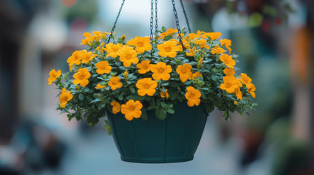 A vibrant display of bright yellow flowers hanging in a green planter, set against a softly blurred urban background, showcasing the beauty of nature and spring.