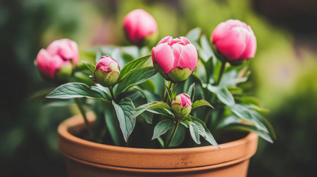 Gorgeous pink peony flowers arranged in a terracotta pot, surrounded by lush green leaves, creating a vibrant and serene atmosphere in a garden setting.