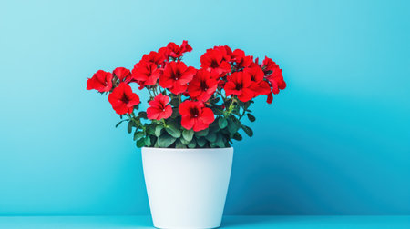 A vibrant arrangement of red geranium flowers sits in a sleek white pot against a calming turquoise backdrop, ideal for showcasing floral beauty and home decor inspiration.