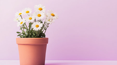 A charming pot of white daisies brings joy and freshness to any space. Set against a soft purple backdrop, this image embodies serenity and natural beauty.