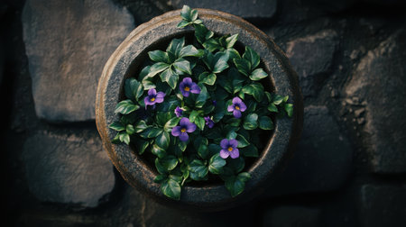 This captivating image features delicate purple flowers nestled among vibrant green leaves in a rustic stone pot, creating a peaceful garden atmosphere.