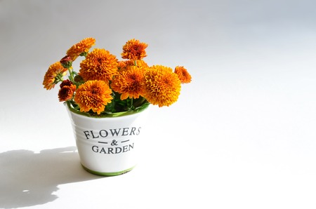Bouquet of chrysanthemum flowers and green leaves in a decorative white pot on a white background with its own shadow