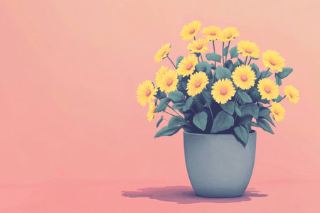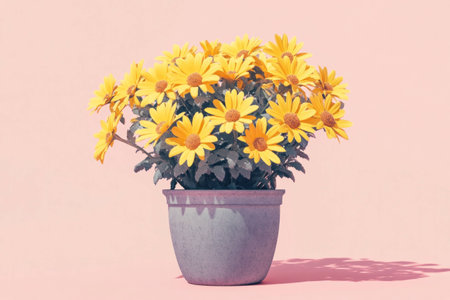 Bright yellow daisies in a rustic pot against a soft pink background, evoking a warm spring feel, perfect for nature and floral themes, home decor, and cheerful moods