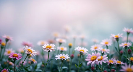 Field of daisies with pink petals, with soft, blurred background that transitions from light to dark