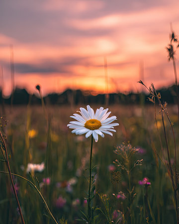 A daisy stands tall in a field, its white petals and yellow center contrasting against a blurred background. The image showcases warm colors, a shallow depth of field, and natural lighting. This visual can be utilized in various commercial and editorial projects.