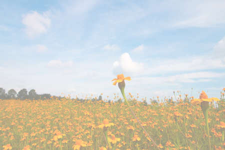 Scenery with cosmos representing autumn . yellow flower blooming in the field, vintage warm tone . free and joyful concept idea background