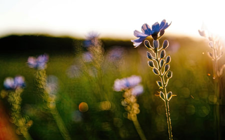 Wildflowers bathed in the warm glow of sunset. A tranquil scene of nature's beauty.
