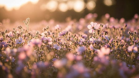 A dreamy meadow filled with soft focus purple and pink wildflowers bathed in warm golden hour sunlight, creating an ethereal glow.