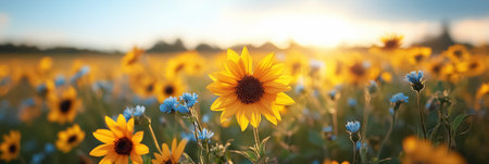 Sunflowers and small blue flowers bloom under warm golden sunset light. Vibrant field setting creates a serene atmosphere ideal for nature lovers. Concept of floral beauty, agriculture, gardening.
