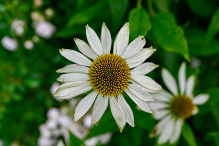 Macro close up of a vibrant blooming flower with a single raindrop, offering free copy space