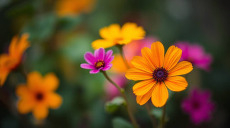 An AI generated illustration of A vibrant, close-up shot of a variety of blooming flowers in a colorful array of shades, including red and orange