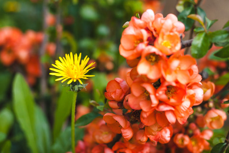 Macro of beautiful romantic forest dreamy magic yellow flower with green leaves background. Toned with filters in retro vintage color. Soft selective focus and blurry floral nature background.