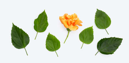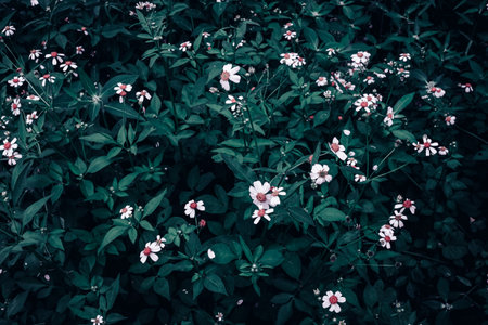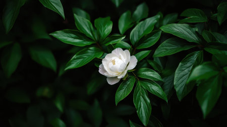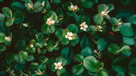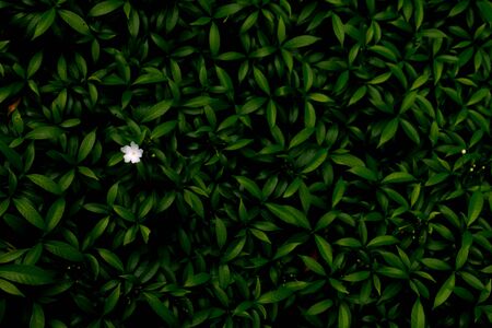 White flower and Green leaves background.Green leaves color tone dark in the morning.Tropical Plant,environment,photo concept nature and plant.