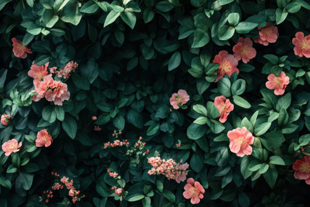 Lush green foliage with vibrant pink flowers creates a tranquil and serene atmosphere ideal for nature lovers and those who appreciate floral beauty
