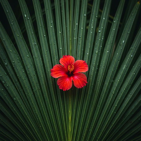 A macro-level study in contrasting tropical textures and colors. A solitary, perfectly formed scarle