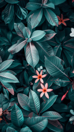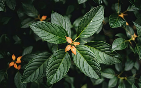 Foliage of tropical leaf in dark green with flower, abstract nature background.