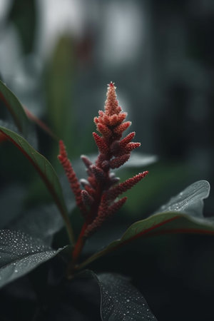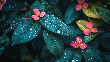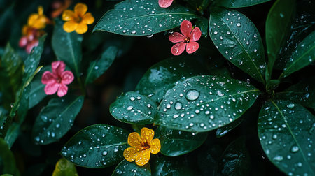 Close-up of tropical leaves showcasing vibrant colors and glistening rain droplets. The lush garden setting reflects the beauty of nature in the early morning hours.