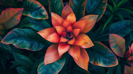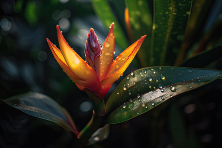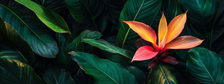 A vibrant tropical flower glowing amidst lush green foliage in a serene garden setting during the early hours of dawn