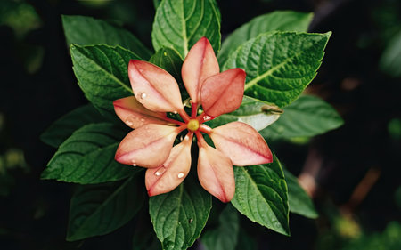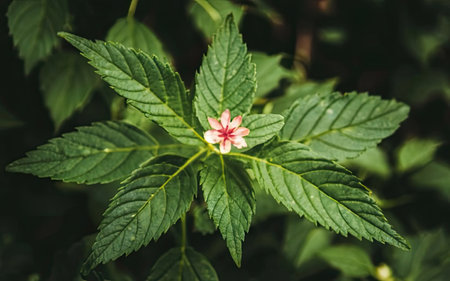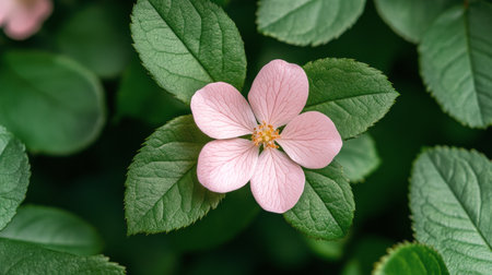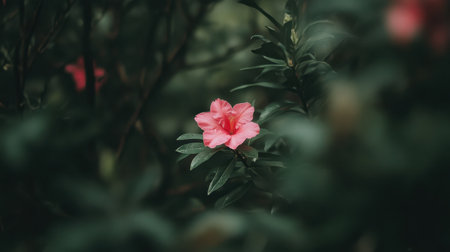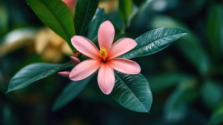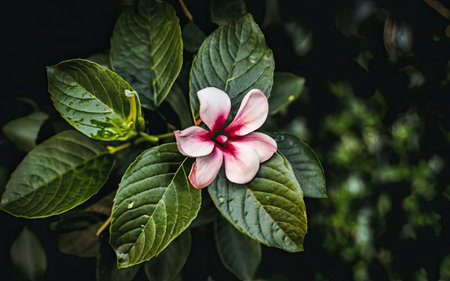 A beautiful pink flower blooms among rich green leaves, showcasing nature's delicate beauty. Perfect for themes of growth, tranquility, and natural elegance.
