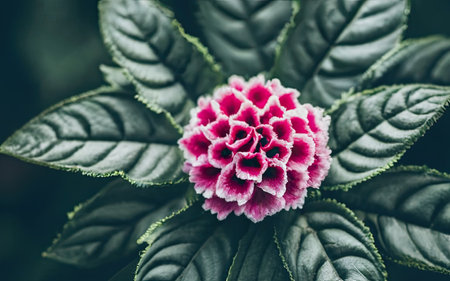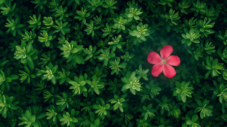 A striking close-up showcases a solitary pink flower at the center, set against a backdrop of deep green foliage. The leaves exhibit a textured surface, and the composition uses selective focus. This image could be suitable for various design projects, including editorial features or marketing visuals.