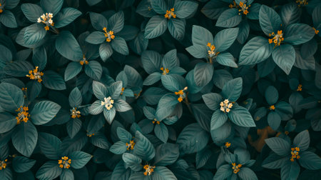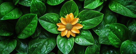 Green leaves texture with a tiny yellow flower in behind. Leaf texture background