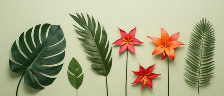 A stunning display of vibrant tropical flowers, featuring hibiscus in yellow and white, surrounded by lush green leaves, perfect for nature-inspired projects.