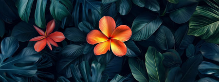 Brightly colored orange and red tropical flowers surrounded by lush green leaves in a dark setting