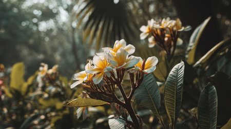 A captivating image of vibrant white and yellow plumeria flowers blooming amidst lush greenery, capturing the essence of tranquility and beauty in nature.