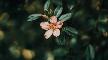 A delicate pink flower opens amidst lush green leaves and budding flowers, creating a tranquil atmosphere in a natural setting, perfect for capturing the beauty of springtime.