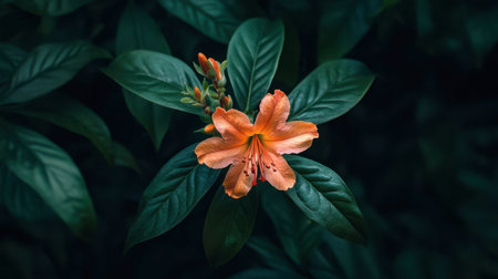 A striking orange flower stands out against dark green leaves, showcasing nature's elegance. The intricate details highlight the beauty and tranquility of the setting.