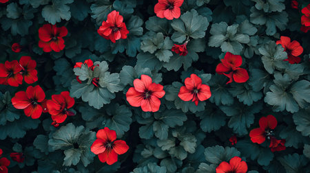 A garden bed filled with bright red geraniums, their blooms standing out vividly against dark green leaves.