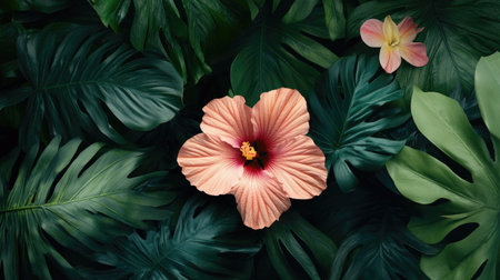 This stunning image features a vibrant hibiscus flower nestled among lush green leaves, showcasing the beauty of nature and tranquility. Perfect for various design projects.