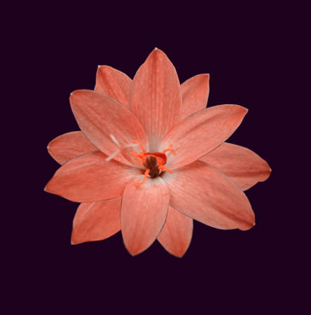 Top view single pastel red crocus flower blossom bloom isolated on dark violet background for stock photo or illustration, summer plants, closeup
