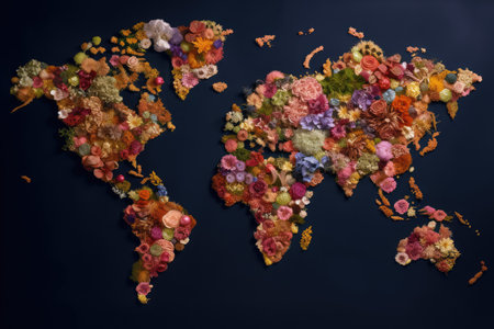 Flower Map, a World Map Made of Flowers on Dark Background, Abstract Generative AI Illustration