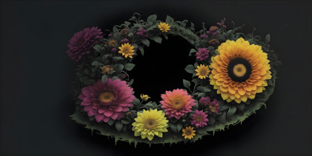 Wreath of flowers on a black background. Colorful flowers.