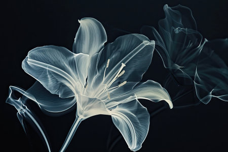 X-ray style of lilies on a black background, showing their delicate details.