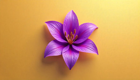 Isolated purple lily flower on plain yellow background, studio shot