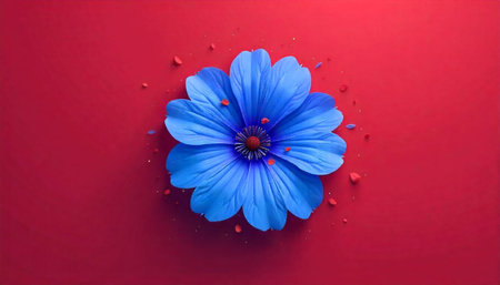 Single blue flower on a red background, petal decorations